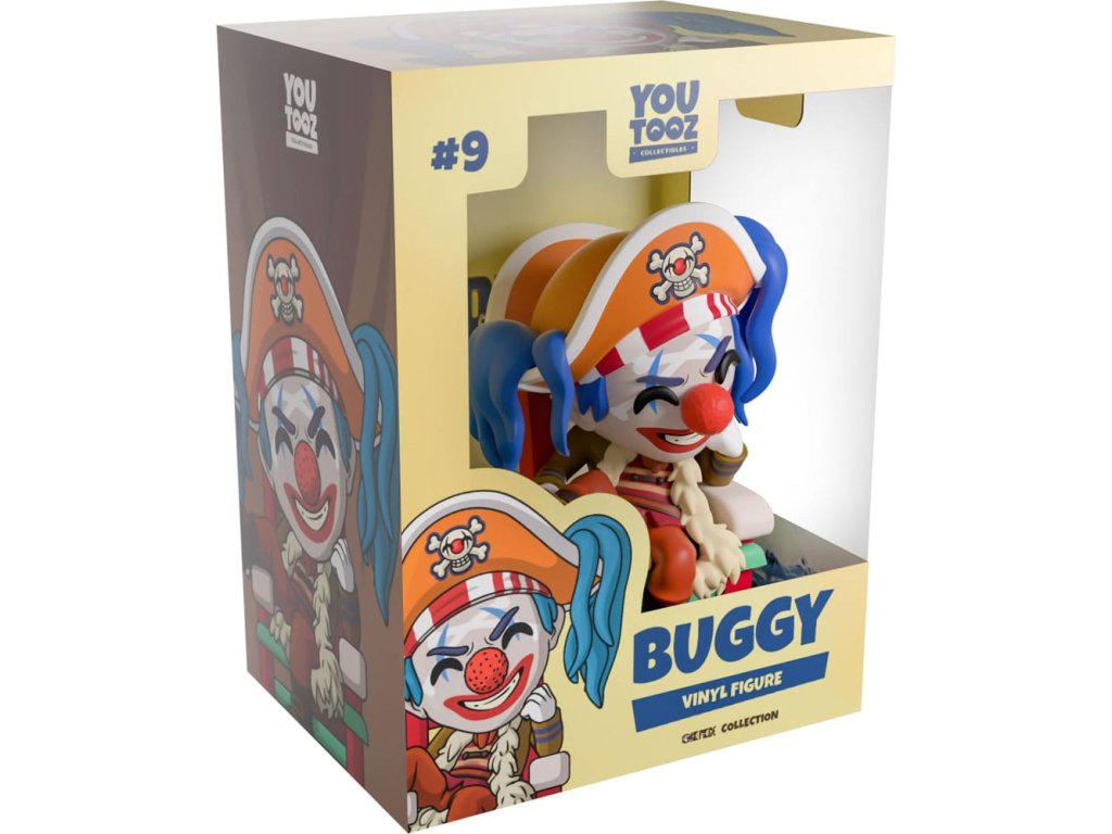 "Vitajte na Buggyho veľkom karnevale! Buggy nastúpil na loď Youtooz, aby ju premenil na svoje nové cirkusové ihrisko! Lenivo sedí vo vysokej stoličke s červenými, zelenými a bielymi pruhmi, nohu má nonšalantne položenú na opierke a bradu opretú o ruku v bielej rukavici. Uprostred maskovanej tváre má veľký červený nos, spoza oranžového pirátskeho klobúka mu trčia dlhé modré vlasy a oblečený je do olivovozeleného kabáta s kožušinovými detailmi, pruhovanej košele, hnedých nohavíc a tmavých topánok s prackami. Na vonkajšom obale je Buggy zobrazený ako sediaci na tróne uprostred cirkusu. Vnútro opäť oživuje žiarivá modrá vlna, ktorá vytvára bielu morskú penu smerom k oblohe pred krásnym bledožltým pozadím, tento dizajn potom plynule prechádza na ochranný obal, kde je možné postavičku vidieť cez veľké priehľadné okienko na jeho prednej strane. Tento zberateľský kúsok sa dodáva v matnom, reliéfnom, ochrannom vonkajšom obale a v plastovom chrániči vlastnej veľkosti na maximálnu ochranu počas prepravy. O One Piece: One Piece je úplne nový seriál spoločnosti Netflix, ktorý je adaptáciou dlhodobo populárnej mangy Shonen, ktorú napísal a ilustroval Eiichiro Oda. Sleduje Luffyho a jeho excentrickú posádku so slamenými klobúkmi, ktorí sa stanú nepravdepodobnými priateľmi a bojujú s nadživotnými zloduchmi na mori, pričom sa snažia stať sa kráľom pirátov a nájsť tajomný One Piece!Dodatočné parametre