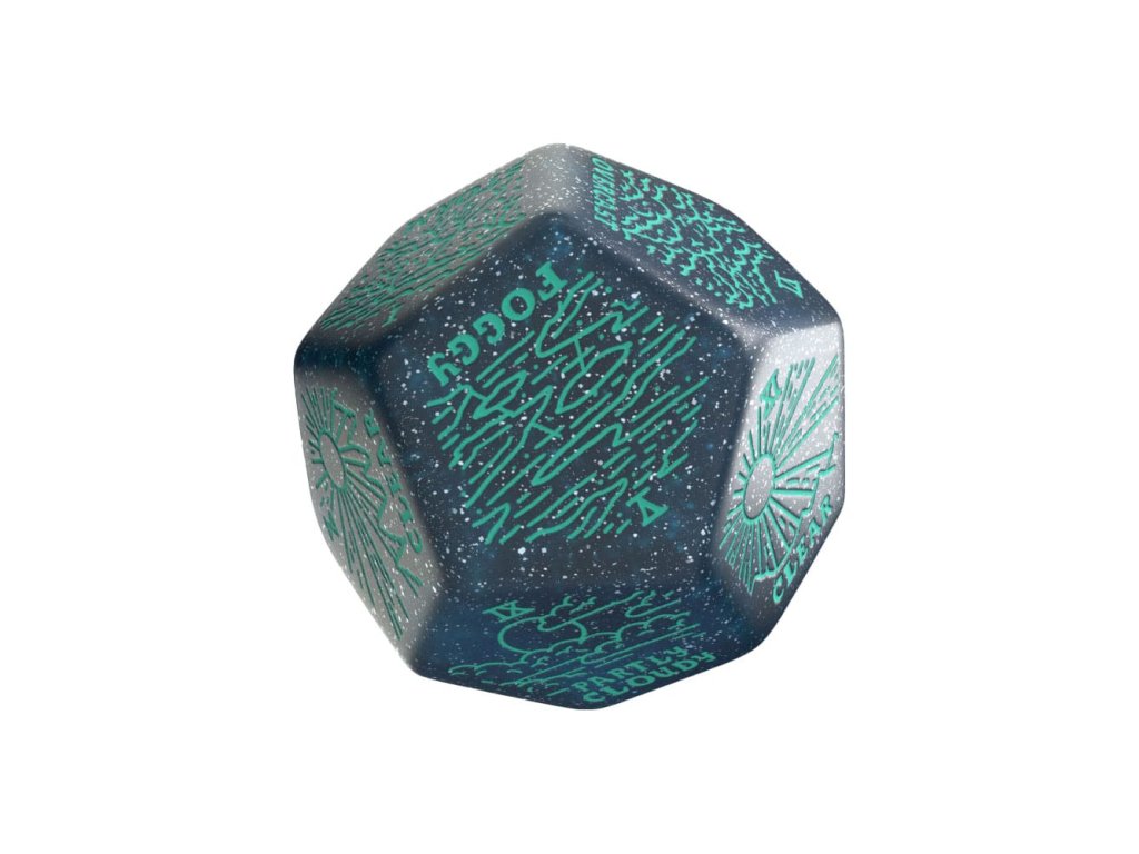 Nechajte kocky rozhodnúť o nálade oblohy nad vašou skupinou! Kocka Weather Generator je veľká kocka D12 navrhnutá spoločnosťou Viridian Dice, ktorá je pripravená určiť náladu vášho sedenia - od jasnej oblohy až po zúriace búrky. Každý hod dodá vašim cestám, stretnutiam a atmosfére vrstvu realizmu a nepredvídateľnosti. Skvelá predpoveď - Veľké kocky D12 s vyrytými dvanástimi typmi počasia zvyšujú ponorenie do hry a vnášajú do nej dynamické prostredie. Osobný meteorologický kanál - Hádžte kockami, aby ste určili: Jasno (×3), čiastočne oblačno (×2), zamračené (×2), hmla, vietor, prehánky, dážď alebo búrka. Kontrastné farby - dokonale čitateľné a vizuálne pútavé farby, iskrivá modrá a tyrkysová. Ľahko čitateľný - Jasný, hlboko vyrytý text zaručuje čitateľnosť pri slabom svetle baterky alebo cez stôl. Skvelá spolupráca - kocky Weather Generator Dice vyrába spoločnosť Q WORKSHOP v Poľsku, EÚ, vytvorila ich spoločnosť Viridian Dice a teraz sú k dispozícii v širších distribučných kanáloch.Dodatočné parametre