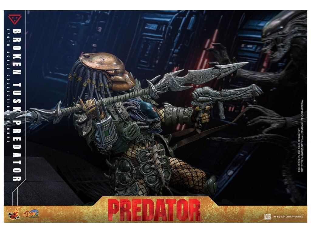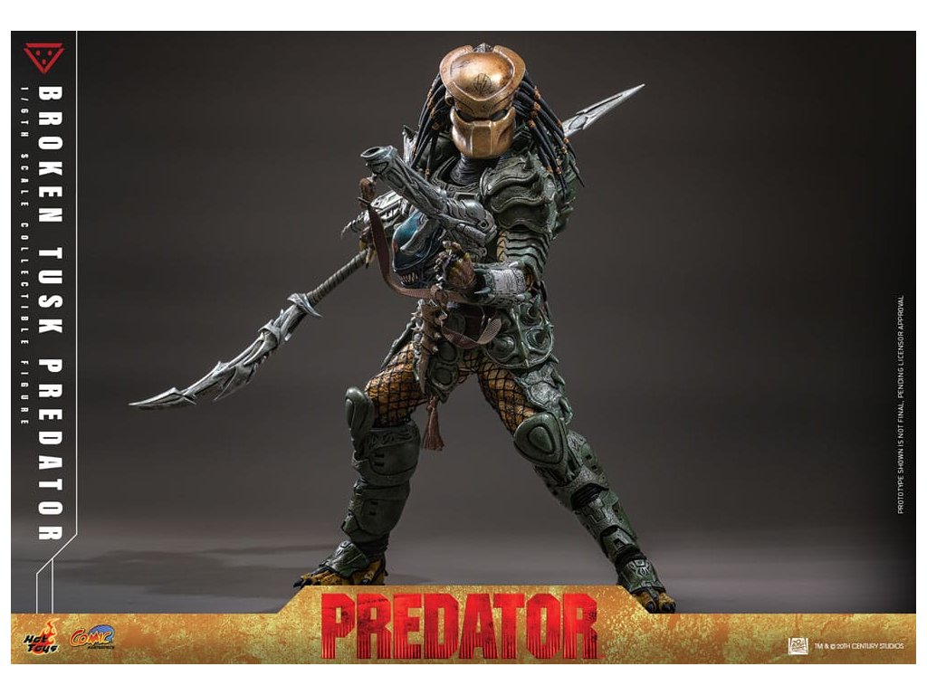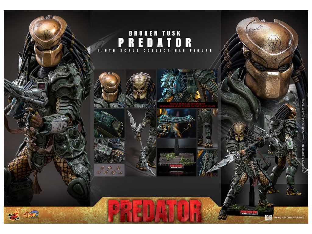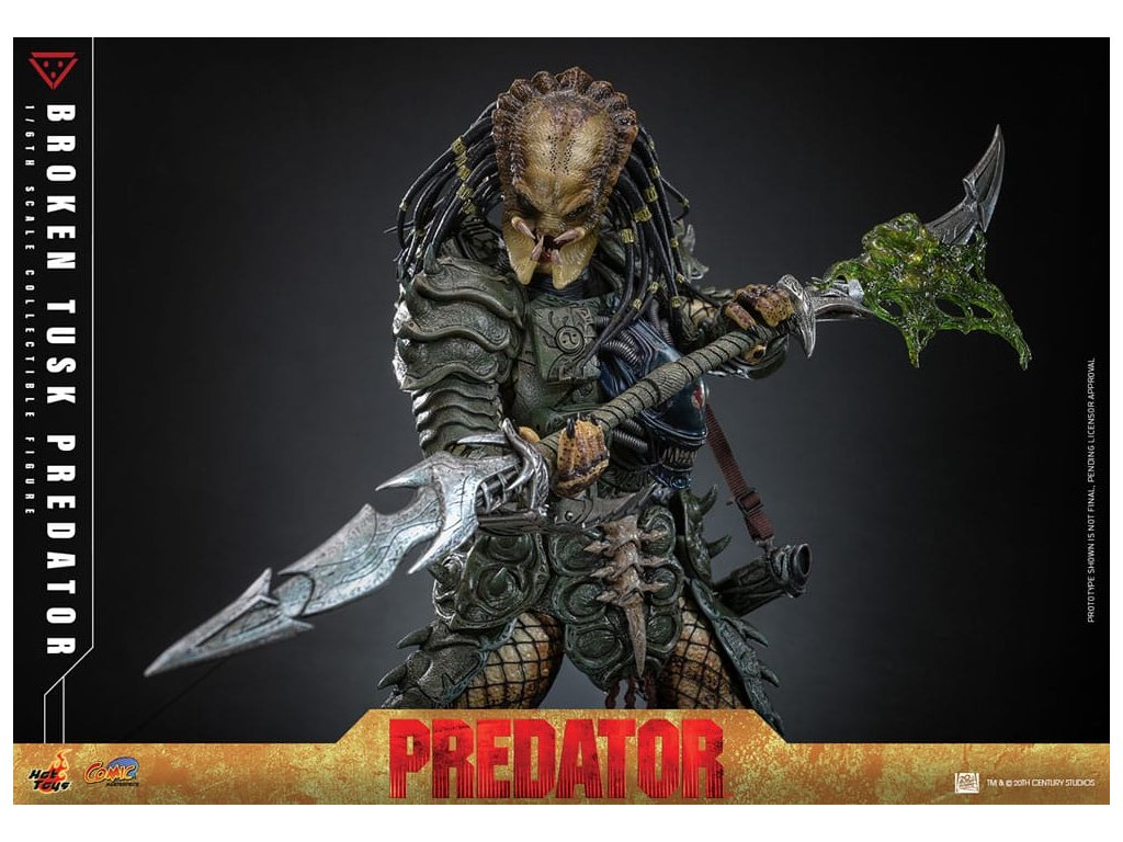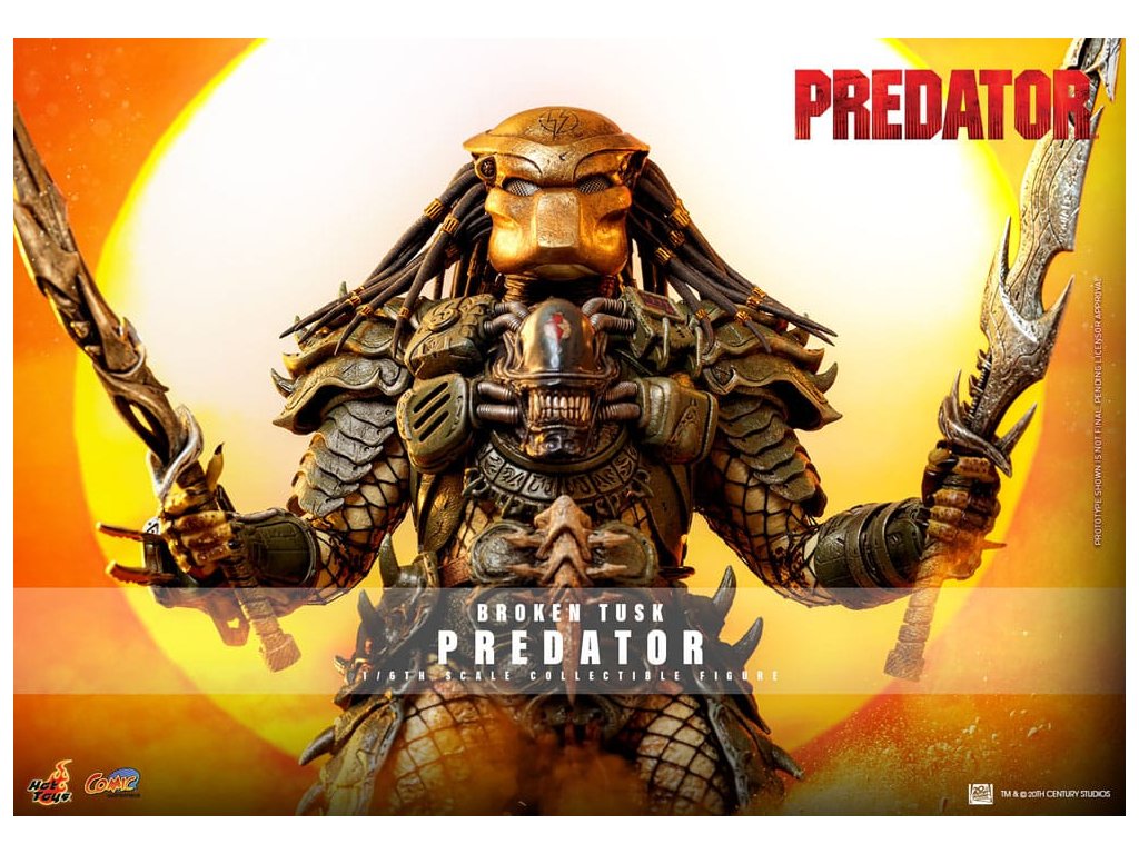 "Spomeňte si na mňa..." - to povedal lovec zlomenín Machiko Noguči tesne pred svojou smrťou. Komiksy Alien vs. Predator nám priniesli srdcervúce bitky medzi Xenomorphmi a Predátormi. Jednou z najvýraznejších postáv je Zlomový lovec, vodca Predátorov so zlomeným tesákom, ktorý sa preslávil ako neľútostný a skúsený lovec. Počas incidentu v Ryushi sa spojil s človekom Machiko Noguči, aby bojovali proti mimozemskej invázii. Ťažko zranený kráľovnou pred svojou smrťou pokrstil Machiko na pravého lovca - posledný čin, ktorý spečatil jeho trvalý odkaz. Fanúšikovia stále milujú jeho zmes krutosti, cti a zdráhavého súcitu. Spoločnosti Sideshow a Hot Toys s potešením predstavujú zberateľskú figúrku Breaking Hunter v mierke 1/6, inšpirovanú touto nezabudnuteľnou postavou z komiksov Alien vs. Predator. Táto akčná sci-fi figúrka oživuje tohto nemilosrdného bojovníka, má starostlivo vymodelovanú hlavu s jemnými gumičkami na vlasy a výraznú masku Predátora s jedinečným motívom flashbacku. Je odetý do novo navrhnutého brnenia Predátora s reálnymi efektmi poškodzovania poveternostnými vplyvmi a výrazným dizajnom hlavy Xenomorfa na hrudnom pláte, čo dokonale vystihuje podstatu Lovca zlomenín. Táto figúrka, vybavená širokou škálou zbraní vrátane pochodne, dvojitého meča, ktorý sa dá rozdeliť na dva samostatné meče, a zápästnej čepele, ktorú možno pripevniť na rukáv, je pripravená na boj. Navyše sa dodáva s podstavcom s motívom relikvie Xenomorph, ktorý dodá vašej expozícii ďalšiu vrstvu hĺbky. Špeciálna edícia, ktorá je dostupná len na vybraných trhoch, obsahuje navyše masku poškodenú v boji pre ďalšie možnosti vystavenia. Nepremeškajte príležitosť predobjednať si túto pôsobivú figúrku a dajte tomuto neľútostnému bojovníkovi šancu obhájiť si miesto vo vašej zbierke!Dodatočné parametre