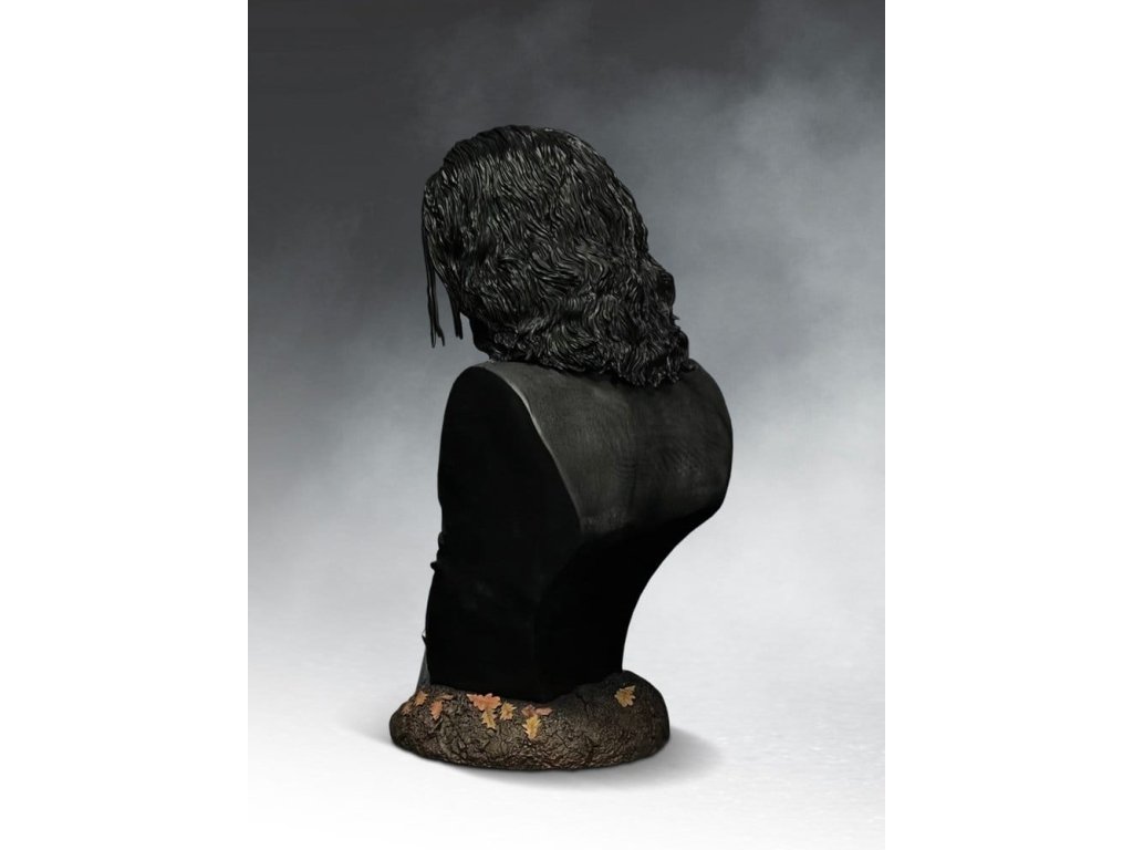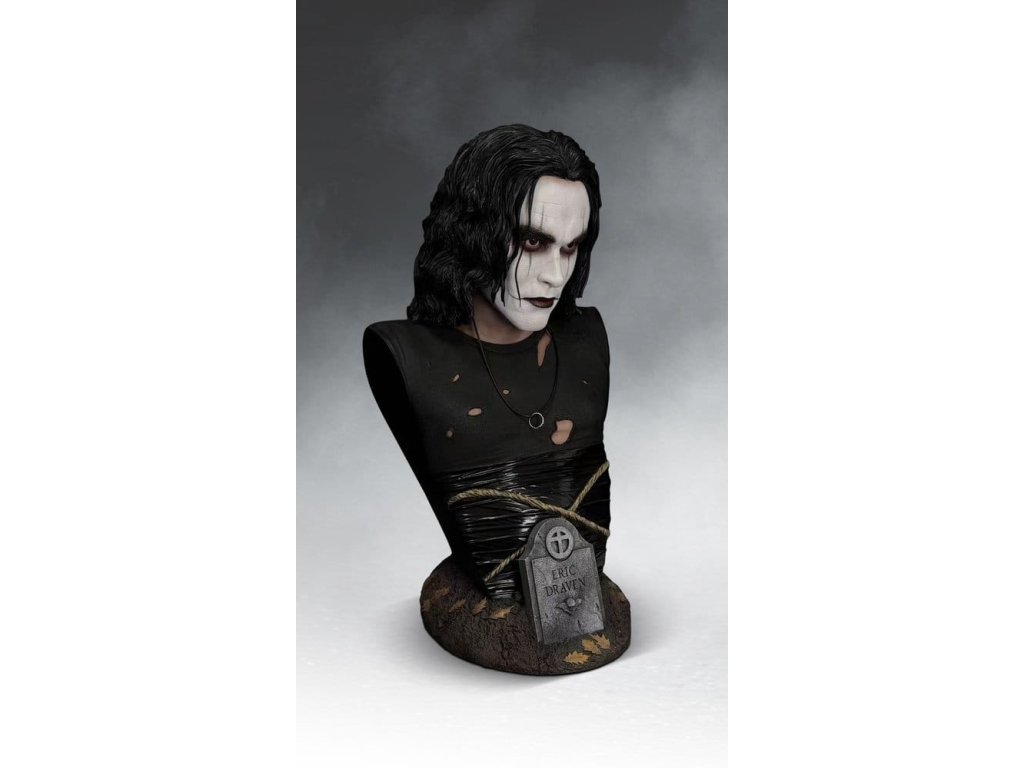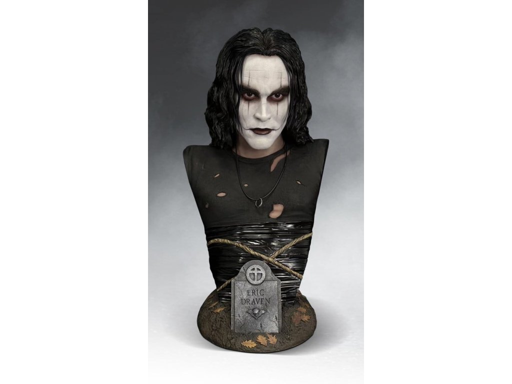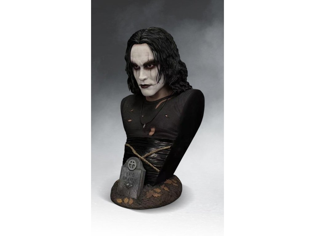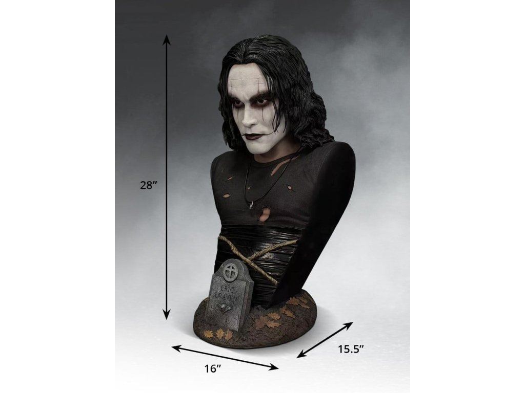 Táto 71 cm vysoká busta v životnej veľkosti je pôsobivou poctou nezabudnuteľnému výkonu Brandona Leeho v úlohe Erica Dravena vo filme The Crow a zachytáva postavu v momente chladnej rozhodnosti. Každý obrys jeho tváre bol starostlivo vytvarovaný tak, aby odrážal prísnu, poetickú intenzitu a nahromadený hnev, ktoré definovali jeho výkon. Ikonická maľba masky je vrstvená s jemnou textúrou, čím sa zachováva surový, ručne nanesený vzhľad, ktorý dodal postave ľudskosť. Prémiové akrylové oči dodávajú portrétu život s fascinujúcim realizmom. Zachytávajú a udržiavajú len dostatočný odraz, takže keď sa pohybujete okolo diela, pohľad akoby vás nasledoval, čím vytvára znepokojujúci pocit prítomnosti, ktorý maľované oči jednoducho nedokážu zopakovať. každý kus je ručne dokončený a ručne maľovaný, aby sa dosiahli nuansované tóny pleti, zatiaľ čo realistická štruktúra lana a kontrastné povrchové úpravy dodávajú jeho ikonickému kostýmu hĺbku a definíciu. tematický základ ukotvuje dielo v Ericovej mytológii. Poveternostnými vplyvmi ošľahaný náhrobný kameň s jeho menom vyrastá z textúrovanej zeme posiatej opadaným lístím, čo dodáva buste atmosféru bez toho, aby prekrývala samotný portrét. nádherná pocta výkonu, ktorý z postavy urobil legendu! Limitované na 500 kusov.Dodatočné parametre