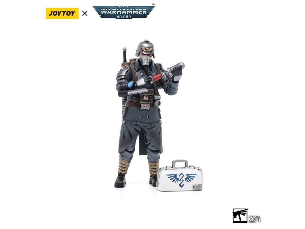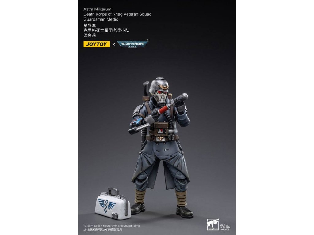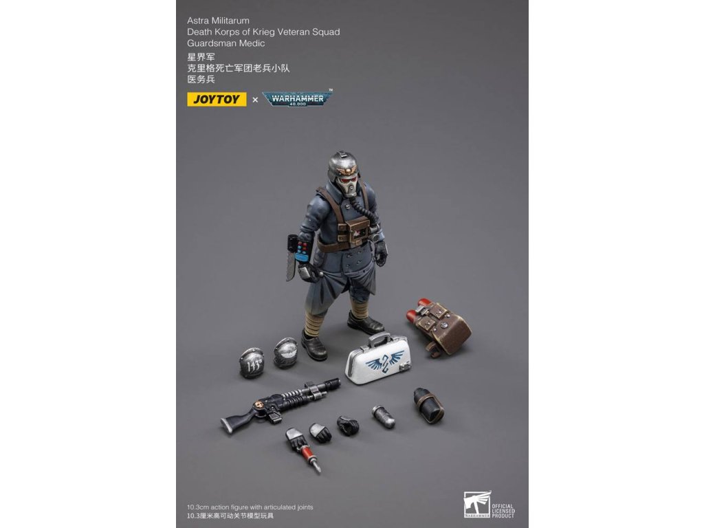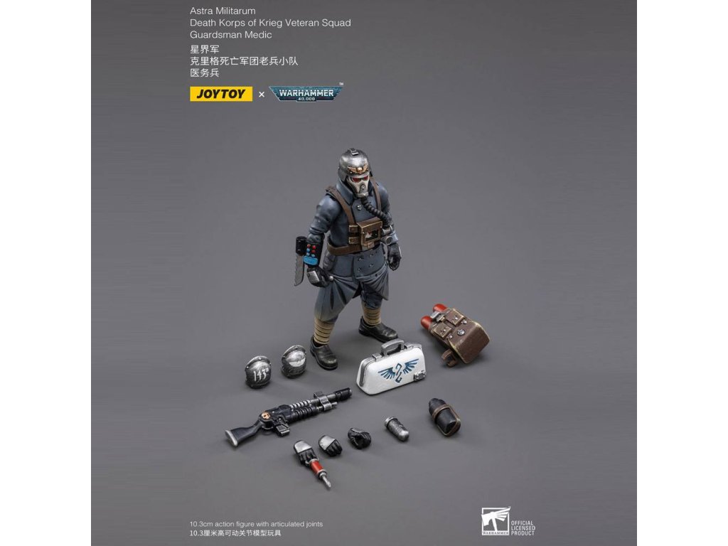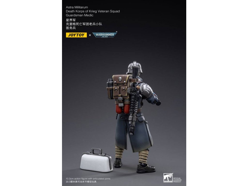 Joy Toy predstavuje nový rad figúrok v mierke 1:18 zo série Warhammer 40k, konkrétne veteránov Death Korps of Krieg. Každá figúrka má vymeniteľné ruky a doplnky k zbraniam a je vysoká 10 až 15 cm. Vlastnosti produktu: - 10 palcov (10,3 cm) - Mierka 1/18 - Vyrobené z plastu - Na základe Warhammer 40K - Vysoko detailné - Plne kĺbové. Obsah balenia: - Figúrka Medika - Pancier na plecia - Puška - Batoh - Lekárska taška - Fľaša - Ruka so striekačkou - Alternatívny pár rúk.Dodatočné parametre