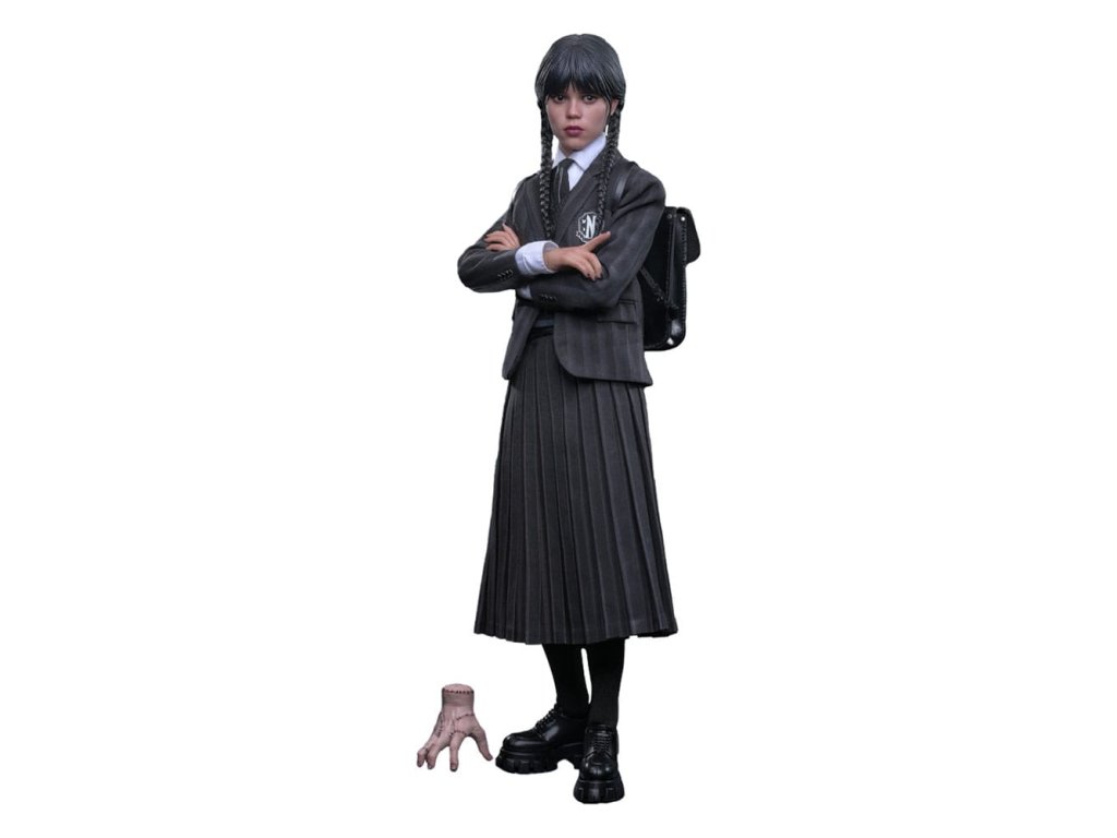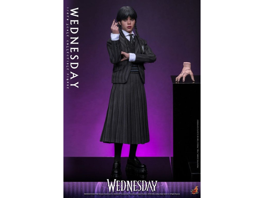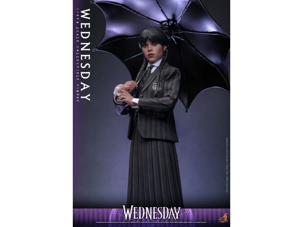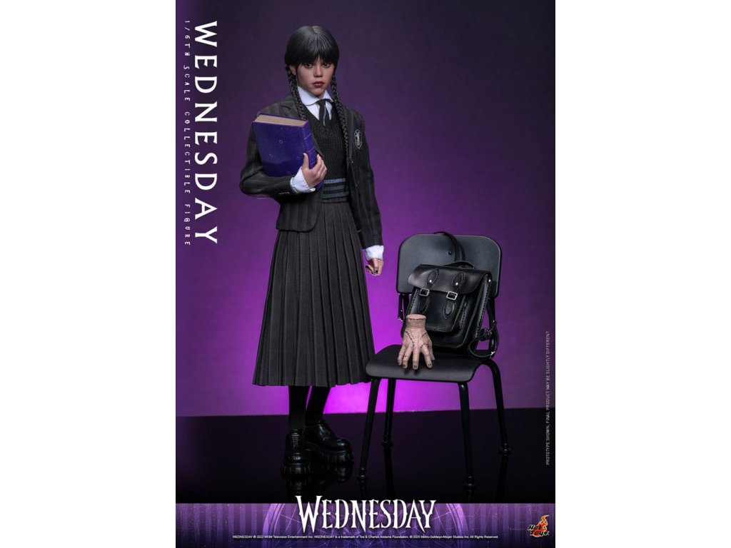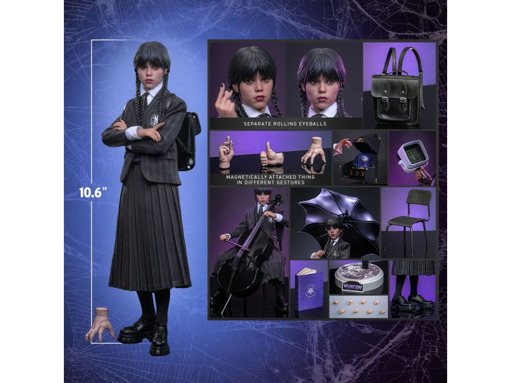 Spoločnosti Sideshow a Hot Toys s hrdosťou predstavujú zberateľskú figúrku Wednesday v mierke 1/6, inšpirovanú nezabudnuteľným stvárnením Wednesday od Jenny Ortegy zo seriálu Wednesday od Netflixu. Táto akčná figúrka má starostlivo spracovanú hlavu so samostatne otáčajúcimi sa očami, starostlivo vymodelovaný model čiernych vlasov s detailmi vrkoča a výrazom tváre, textúrou pokožky a mejkapom, ktorý zachytáva Wednesdayin typický nespútaný šarm. Figúrka má novo vytvarované telo, je vysoká približne 27 cm a má 25 bodov artikulácie, ktoré kopírujú jej postavu zo seriálu. Dodáva sa s ôsmimi novo vyrobenými vymeniteľnými rukami pre rôzne expresívne pózy, od jej ikonických lusknutí prstov až po držanie rôznych doplnkov. Postavička v šiestom meradle je oblečená do presne ušitej uniformy Nevermore Academy vrátane pruhovaného saka s magnetickými prvkami na ramenách, svetra, košele, kravaty, pruhovanej plisovanej sukne, pančúch a topánok. Súprava obsahuje množstvo doplnkov vrátane batohu, dáždnika, violončela s kolou, stoličky, sledovacieho zariadenia, krištáľovej gule s puzdrom a denníka Nightshade Society s prorockými kresbami Wednesdaya Adamsa a Josepha Crackstona. Nemožno opomenúť ani ruku, ktorá sa dodáva ako príslušenstvo v troch rôznych stavoch vrátane normálneho stavu, gesta lusknutia prstov a gesta zdvihnutého palca. Taktiež sa magneticky pripája k ramenám Centra pre dynamické možnosti zobrazenia. Špeciálne navrhnutý kruhový stojan na figúrku s motívom kamennej podlahy a logom Wednesday dopĺňa túto temnú prezentáciu, vďaka čomu je táto figúrka povinným zberateľským kúskom pre všetkých fanúšikov Wednesday.Dodatočné parametre