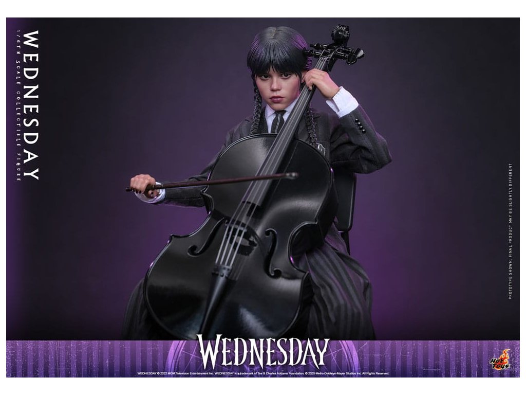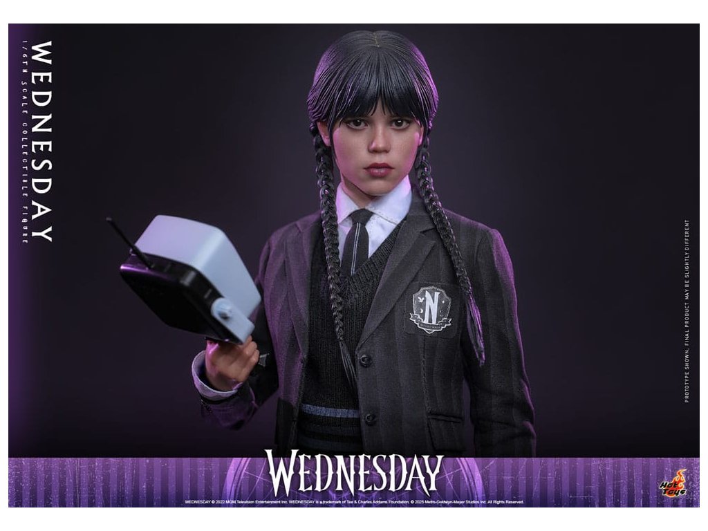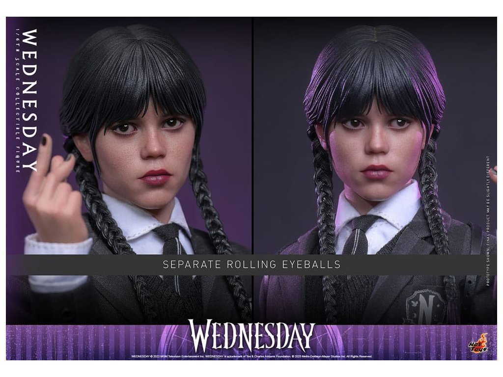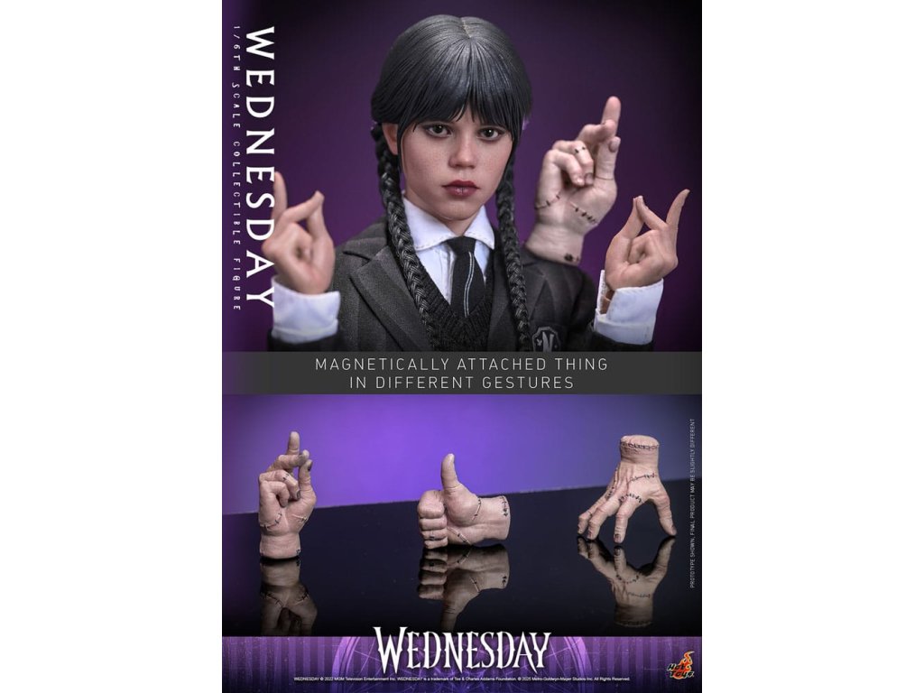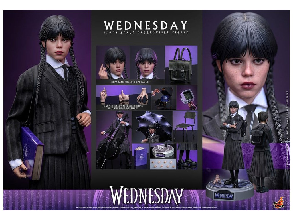 Spoločnosti Sideshow a Hot Toys s hrdosťou predstavujú zberateľskú figúrku Wednesday v mierke 1/6, inšpirovanú nezabudnuteľným stvárnením Wednesday od Jenny Ortegy zo seriálu Wednesday od Netflixu. Táto akčná figúrka má starostlivo spracovanú hlavu so samostatne otáčajúcimi sa očami, starostlivo vymodelovaný model čiernych vlasov s detailmi vrkoča a výrazom tváre, textúrou pokožky a mejkapom, ktorý zachytáva Wednesdayin typický nespútaný šarm. Figúrka má novo vytvarované telo, je vysoká približne 27 cm a má 25 bodov artikulácie, ktoré kopírujú jej postavu zo seriálu. Dodáva sa s ôsmimi novo vyrobenými vymeniteľnými rukami pre rôzne expresívne pózy, od jej ikonických lusknutí prstov až po držanie rôznych doplnkov. Postavička v šiestom meradle je oblečená do presne ušitej uniformy Nevermore Academy vrátane pruhovaného saka s magnetickými prvkami na ramenách, svetra, košele, kravaty, pruhovanej plisovanej sukne, pančúch a topánok. Súprava obsahuje množstvo doplnkov vrátane batohu, dáždnika, violončela s kolou, stoličky, sledovacieho zariadenia, krištáľovej gule s puzdrom a denníka Nightshade Society s prorockými kresbami Wednesdaya Adamsa a Josepha Crackstona. Nemožno opomenúť ani ruku, ktorá sa dodáva ako príslušenstvo v troch rôznych stavoch vrátane normálneho stavu, gesta lusknutia prstov a gesta zdvihnutého palca. Taktiež sa magneticky pripája k ramenám Centra pre dynamické možnosti zobrazenia. Špeciálne navrhnutý kruhový stojan na figúrku s motívom kamennej podlahy a logom Wednesday dopĺňa túto temnú prezentáciu, vďaka čomu je táto figúrka povinným zberateľským kúskom pre všetkých fanúšikov Wednesday.Dodatočné parametre