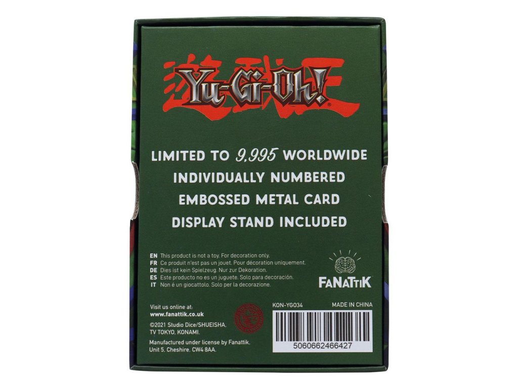 Limitovaný počet 9 995 kusov na celom svete, obojstranne opečiatkovaná, individuálne číslovaná prémiová kovová karta od Fanattik. Dodáva sa v darčekovej škatuľke so stojanom.UPOZORNENIE: Vzhľadom na malý náklad a vysoký dopyt po tomto výrobku sa očakáva distribúcia.Dodatočné parametre