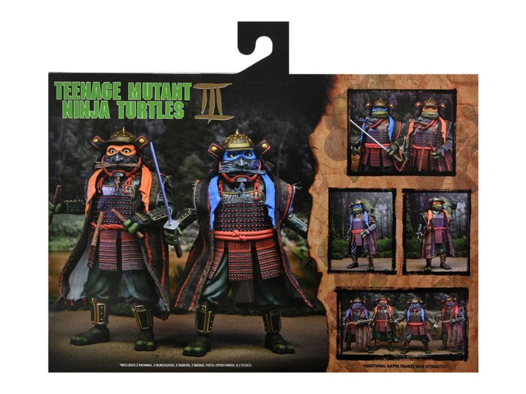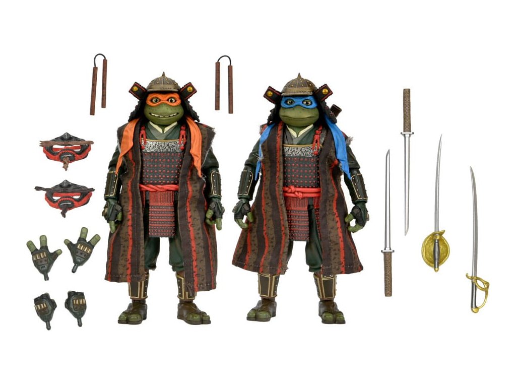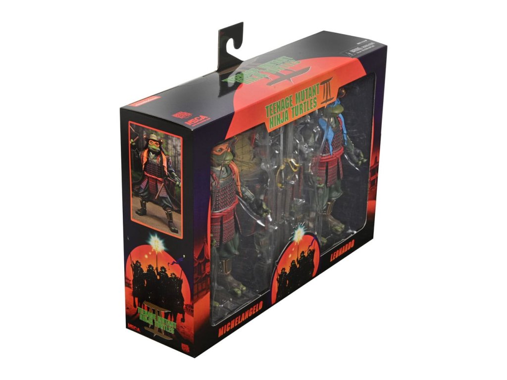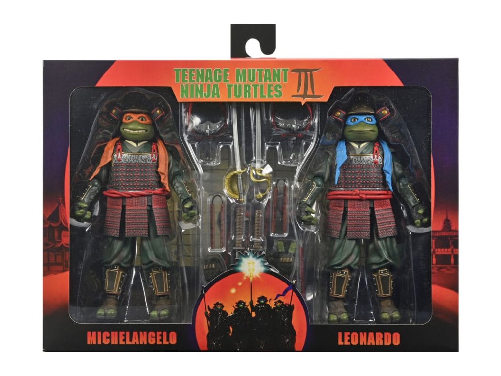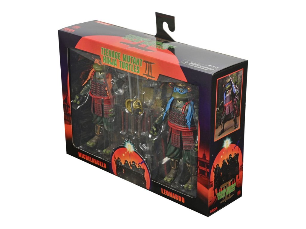Doplň svoju zbierku filmovej trilógie TMNT od spoločnosti NECA o tieto úžasné 2-packové figúrky zo série Muppets of Ninja Zelv III! Získaj Leonarda a Michelangela v ich samurajskom odeve ako úplne radikálne akčné figúrky v 7-palcovej mierke. Figúrky sa dodávajú s vymeniteľnými rukami, 2 maskami oni, 2 katanami, 2 nunčakmi a 2 šabľami. Balené so sklenenou prednou časťou.Dodatočné parametre