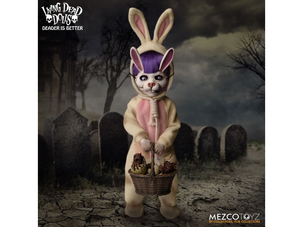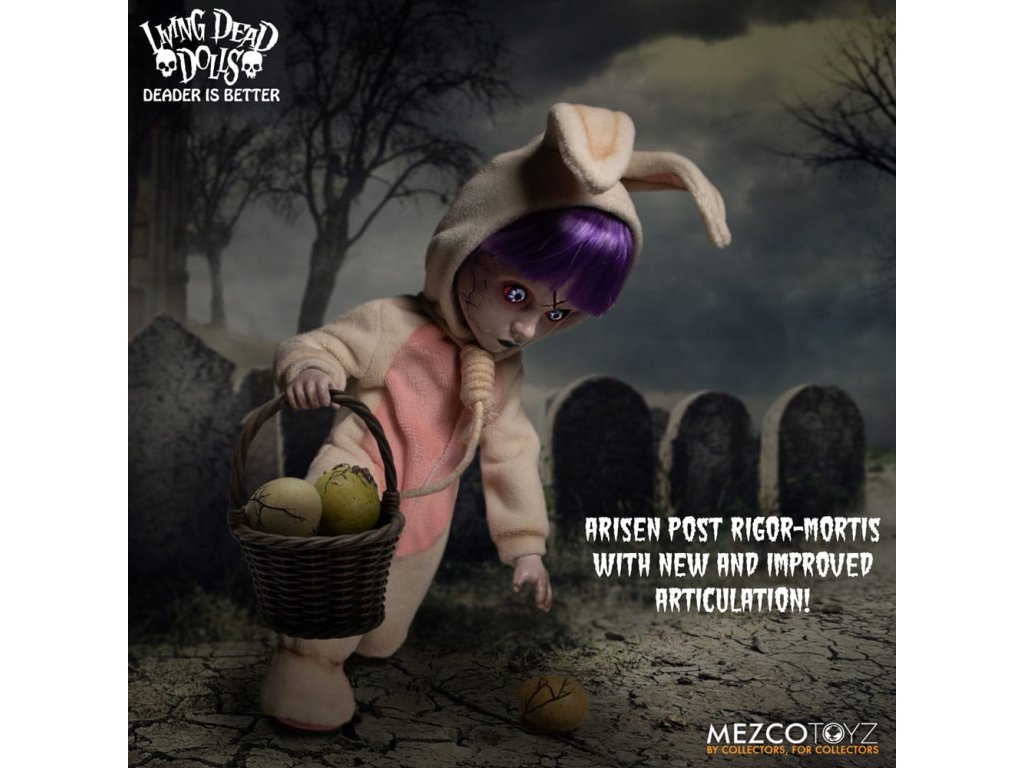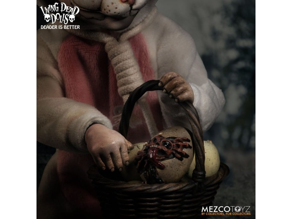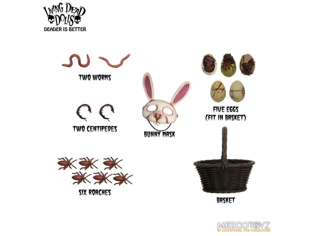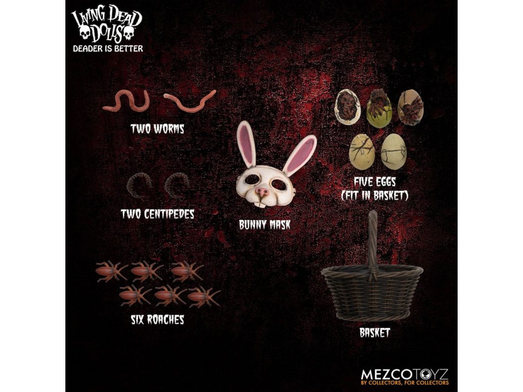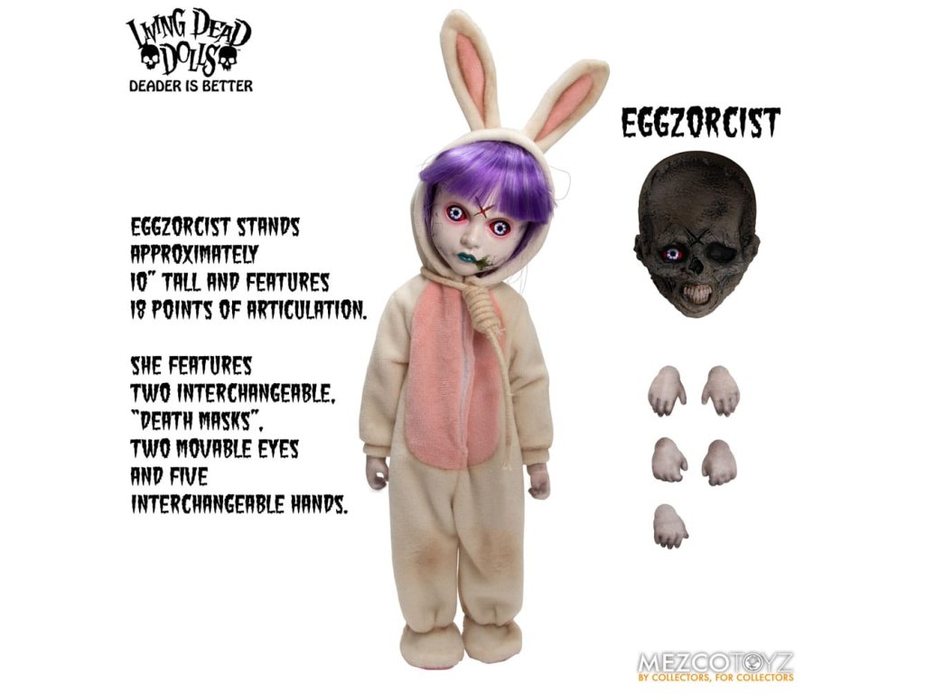 Návrat živých mŕtvych bábik: Eggzorcist Po dlhšom pátraní je Eggzorcist späť! Hra Living Dead Dolls ponúka viac strachu a potešenia s návratom Eggzorcistu - úplne prepracovaného a mŕtveho ako kedykoľvek predtým! Tento diabolský zajačik je očarený vymeniteľnými výrazmi tváre a rúk, pohyblivými očami, vylepšenou artikuláciou a množstvom desivých chrobákov... Oblečený do svojho neslávne známeho roztrhaného králičieho kostýmu so slučkou okolo krku a odnímateľnou králičou maskou Eggzorcist skočí priamo do tvojich nočných môr! Hniloba - vymeň jej tvárovú dosku "Maska smrti" z prenikavého pohľadu na hnijúci, prízračný výraz! Jej sklenené oči sa môžu pohybovať pomocou ovládacích prvkov vo vnútri hlavy. Eggzorcist má 18 bodov artikulácie a 6 vymeniteľných rúk, ktoré umožňujú rôzne jedinečné možnosti pózovania. Dodáva sa spolu s košíkom s papierovou trávou, množstvom vajíčok v rôznych štádiách liahnutia, ktoré sa jej pekne zmestia do košíka, množstvom chrobákov a králičou maskou, ktorá jej dobre sedí na hlave. Vajíčkarka je zabalená v škatuli v tvare rakvy. ŽIVÁ SMRTIHODNÁ BÁBKA VLASTNOSTI - EGGZORCIST: Bábika: - Približne 10" vysoká- Osemnásť bodov artikulácie- Jedna vymeniteľná, výrazná "maska smrti"- Dve pohyblivé oči- Šesť vymeniteľných rúkOblek:- Jeden ošúchaný králičí kostým s integrovaným drôtom na pózovanie uší- Jedna skutočná povrazová slučkaPríslušenstvo:- 1x košík s papierovou trávou- 1x maska králika- 2x červy- 2x stonožky- 5x vajíčka v rôznych štádiách liahnutia (zmestia sa do košíka)- 6x šváby