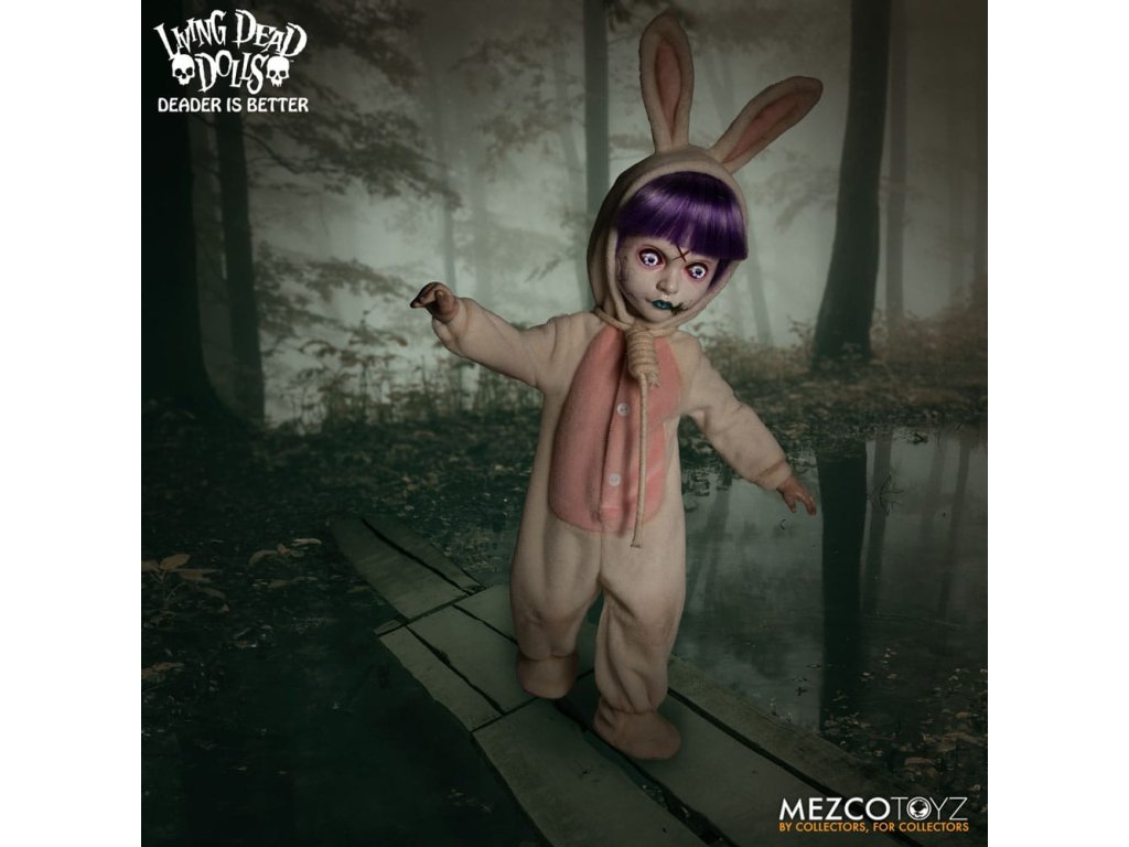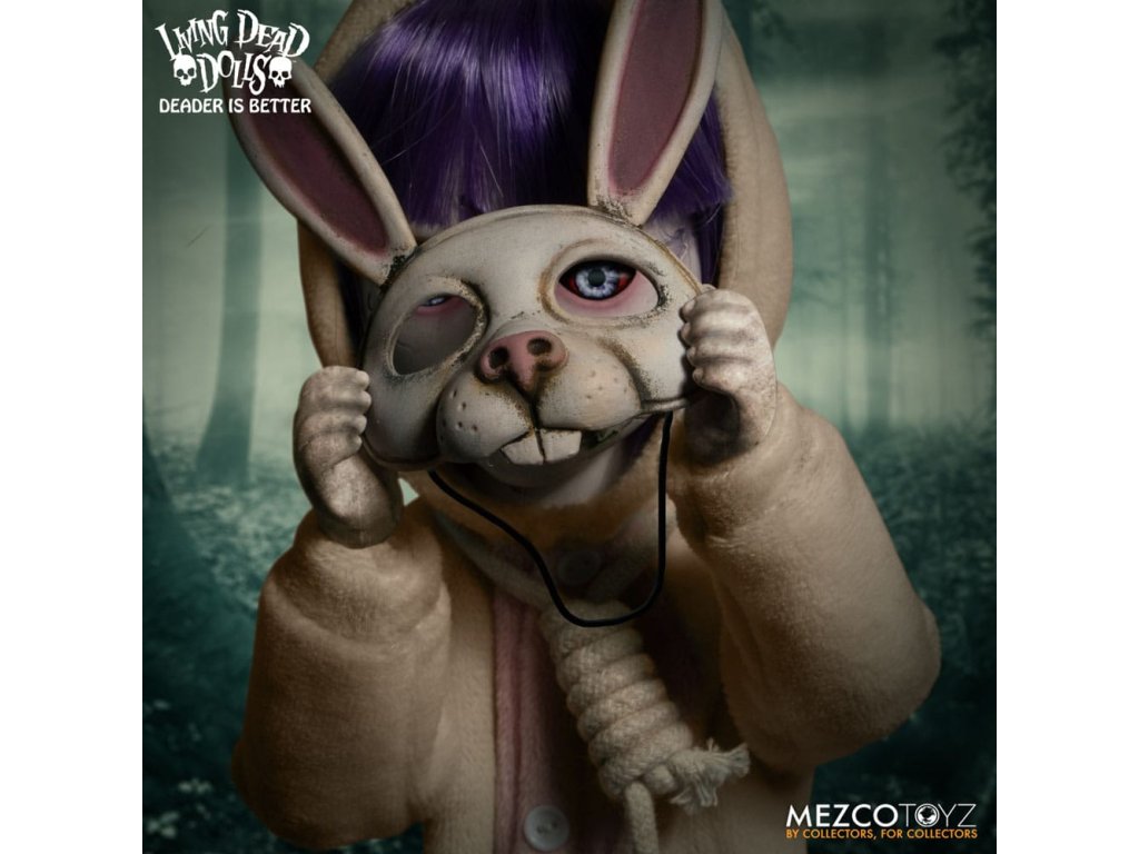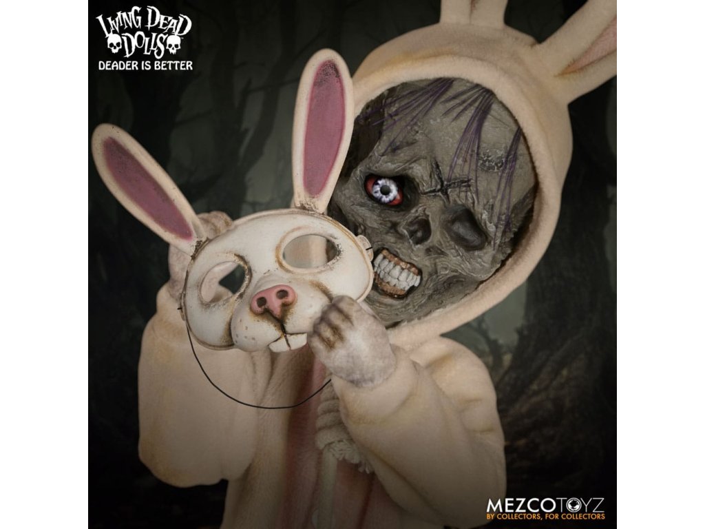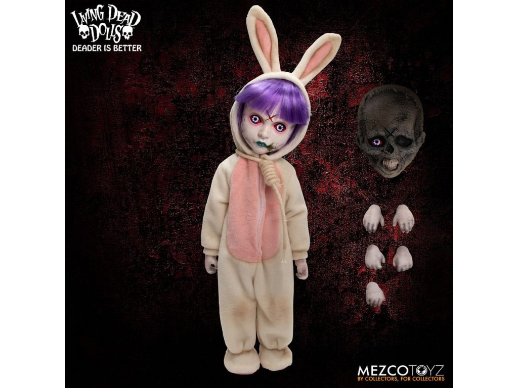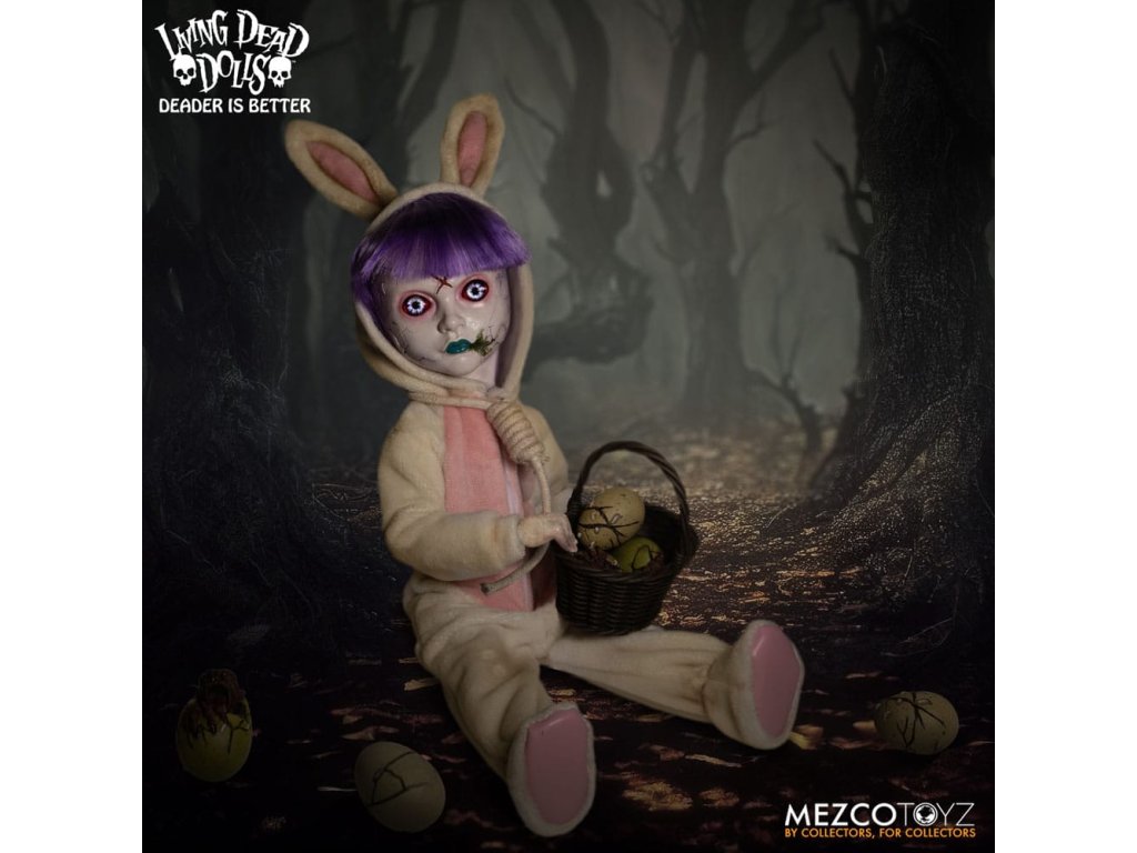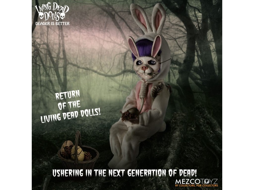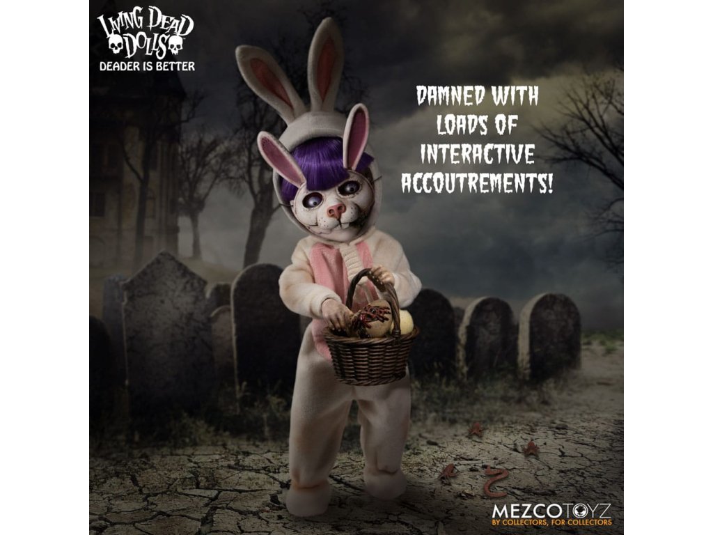 Návrat živých mŕtvych bábik: Eggzorcist Po dlhšom pátraní je Eggzorcist späť! Hra Living Dead Dolls ponúka viac strachu a potešenia s návratom Eggzorcistu - úplne prepracovaného a mŕtveho ako kedykoľvek predtým! Tento diabolský zajačik je očarený vymeniteľnými výrazmi tváre a rúk, pohyblivými očami, vylepšenou artikuláciou a množstvom desivých chrobákov... Oblečený do svojho neslávne známeho roztrhaného králičieho kostýmu so slučkou okolo krku a odnímateľnou králičou maskou Eggzorcist skočí priamo do tvojich nočných môr! Hniloba - vymeň jej tvárovú dosku "Maska smrti" z prenikavého pohľadu na hnijúci, prízračný výraz! Jej sklenené oči sa môžu pohybovať pomocou ovládacích prvkov vo vnútri hlavy. Eggzorcist má 18 bodov artikulácie a 6 vymeniteľných rúk, ktoré umožňujú rôzne jedinečné možnosti pózovania. Dodáva sa spolu s košíkom s papierovou trávou, množstvom vajíčok v rôznych štádiách liahnutia, ktoré sa jej pekne zmestia do košíka, množstvom chrobákov a králičou maskou, ktorá jej dobre sedí na hlave. Vajíčkarka je zabalená v škatuli v tvare rakvy. ŽIVÁ SMRTIHODNÁ BÁBKA VLASTNOSTI - EGGZORCIST: Bábika: - Približne 10" vysoká- Osemnásť bodov artikulácie- Jedna vymeniteľná, výrazná "maska smrti"- Dve pohyblivé oči- Šesť vymeniteľných rúkOblek:- Jeden ošúchaný králičí kostým s integrovaným drôtom na pózovanie uší- Jedna skutočná povrazová slučkaPríslušenstvo:- 1x košík s papierovou trávou- 1x maska králika- 2x červy- 2x stonožky- 5x vajíčka v rôznych štádiách liahnutia (zmestia sa do košíka)- 6x šváby