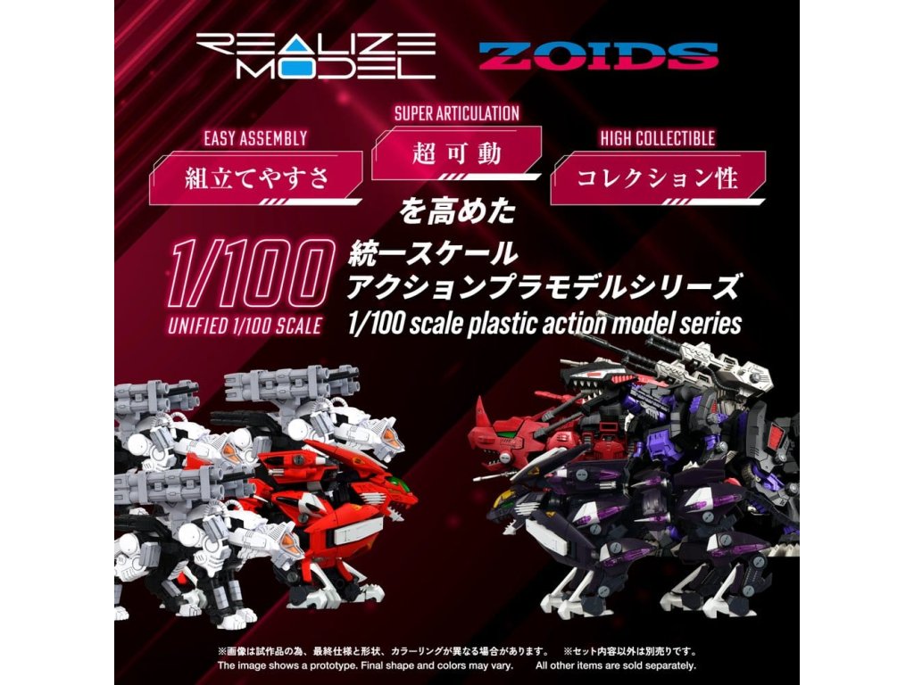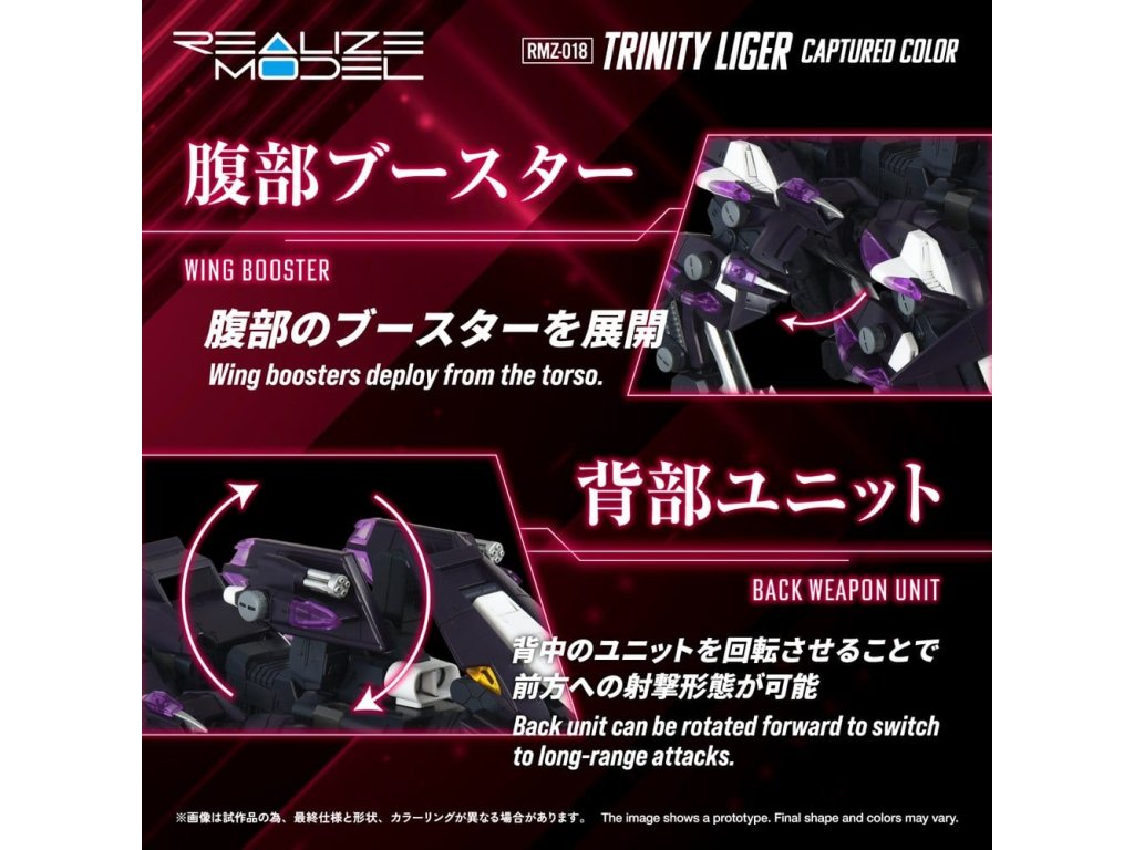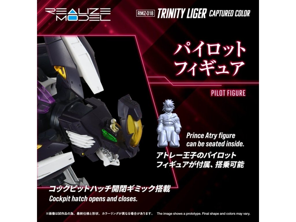 ?REALIZE MODEL?Plastový model v mierke 1:100 z akčnej série. Séria akčných plastových modelov, ktorá kladie dôraz na "super artikuláciu", "jednoduchosť zostavenia" a "zberateľskosť." Nielen počet dielov, ale aj mierka, dizajn a konštrukcia sú navrhnuté z pohľadu používateľa, čím dokonale stelesňujú všetky ideály. Farebný variant z videohry ZOIDS 2: Helic Republic VS Guylos Empire prišiel ako Realize Model. Táto stavebnica je vybavená úplnou artikuláciou tela prostredníctvom pohyblivých mechanizmov a verne stvárňuje všetky charakteristické prvky Trinity Liger: rotujúcu časť hrivy, rozkladacie naskladané zbrane, zadné zbrane, zbrane s pazúrmi a pohyblivé opasky. Jedinečné priehľadné diely a detailné rozčlenenie farebnej schémy zachytených farieb navyše poskytujú vzhľad blízky vizuálnemu stvárneniu v hre už len samotným zložením. Súprava obsahuje jednu figúrku pilota (Atley), ktorú možno usadiť do kokpitu.Dodatočné parametre